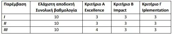 Η μέγιστη συνολική βαθμολογία είναι το δεκαπέντε (15.00). Η ελάχιστη αποδεκτή συνολική βαθμολογία (κατώφλι) είναι το δέκα (10.00) για όλες τις παρεμβάσεις. Επιπλέον, ορίζονται και ελάχιστες αποδεκτές βαθμολογίες ανά κριτήριο ανάλογα με την Παρέμβαση, όπως φαίνεται στον πίνακα που ακολουθεί:
