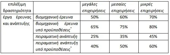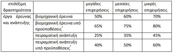 *Η προσαυξημένη ένταση της ενίσχυσης για τη βιομηχανική έρευνα και την πειραματική ανάπτυξη ισχύει, εάν πληρούται μία από τις ακόλουθες προϋποθέσεις: i) το έργο προβλέπει πραγματική συνεργασία μεταξύ μιας επιχείρησης και ενός η περισσοτέρων οργανισμών έρευνας και διάδοσης γνώσεων, οι οποίοι φέρουν τουλάχιστον το 10% των επιλέξιμων δαπανών και έχουν δικαίωμα να δημοσιεύουν τα αποτελέσματα των ερευνών τους ii) τα αποτελέσματα του έργου διαδίδονται ευρέως μέσω συνεδρίων, δημοσιεύσεων, αποθετηρίων ελεύθερης πρόσβασης ή μέσω δωρεάν λογισμικού ή λογισμικού ανοικτής πηγής.