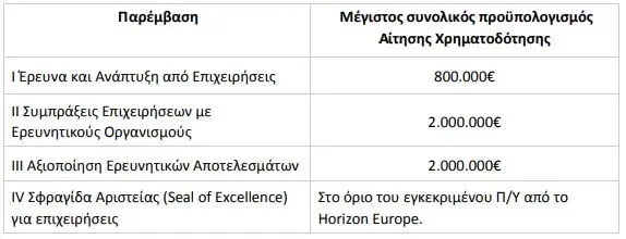 - Συμπράξεις Επιχειρήσεων με Ερευνητικούς Οργανισμούς 180.000.000