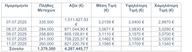 Συγκεκριμένα, πραγματοποιήθηκαν χρηματιστηριακώς μέσω του μέλους του Χ.Α. «Eurobank Equities Μονοπρόσωπη Ανώνυμη Εταιρεία Παροχής Επενδυτικών Υπηρεσιών» οι ακόλουθες αγορές: