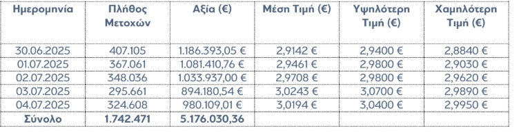 Eγκρίθηκε με την απόφαση της Τακτικής Γενικής Συνέλευσης των Μετόχων της Eurobank Holdings στις 30.04.2025 και σε συνέχεια της από 30.04.2025 απόφασης του Διοικητικού Συμβουλίου της, ενημερώνει το κοινό ότι κατά το διάστημα 30/06/2025 – 04/07/2025 απέκτησε συνολικά, στο πλαίσιο του Προγράμματος, 1.742.471 μετοχές εκδόσεως της ιδίας («Ίδιες Μετοχές») που διαπραγματεύονται στο Χρηματιστήριο Αθηνών («Χ.Α.»), με μέση τιμή κτήσης €2,9705, ανά μετοχή και συνολικό κόστος €5.176.030,36.