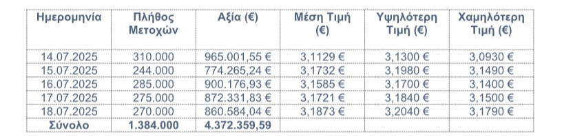 Συγκεκριμένα, πραγματοποιήθηκαν χρηματιστηριακώς μέσω του μέλους του Χ.Α. «Eurobank Equities Μονοπρόσωπη Ανώνυμη Εταιρεία Παροχής Επενδυτικών Υπηρεσιών» οι ακόλουθες αγορές: