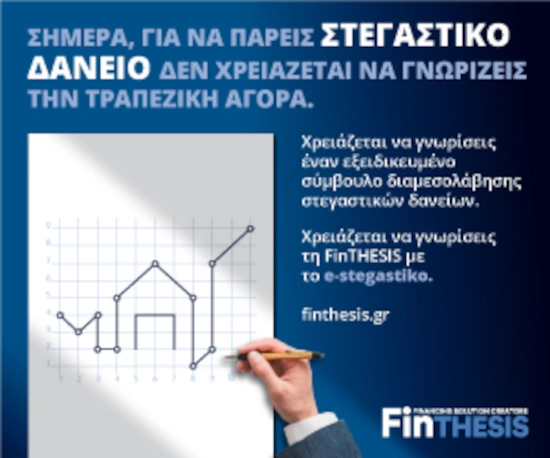 Η FinTHESIS δραστηριοποιείται στον τομέα της διαμεσολάβησης στεγαστικών δανείων. Πρόκειται για εταιρία αδειοδοτημένη και εποπτευόμενη από την Τράπεζα της Ελλάδος και στελεχωμένη από πιστοποιημένους συμβούλους με εμπειρία στον τραπεζικό και δανειακό τομέα, παρέχει στους πελάτες της τη δυνατότητα να συγκρίνουν εύκολα και να επιλέξουν το κατάλληλο γι’ αυτούς τραπεζικό προϊόν.