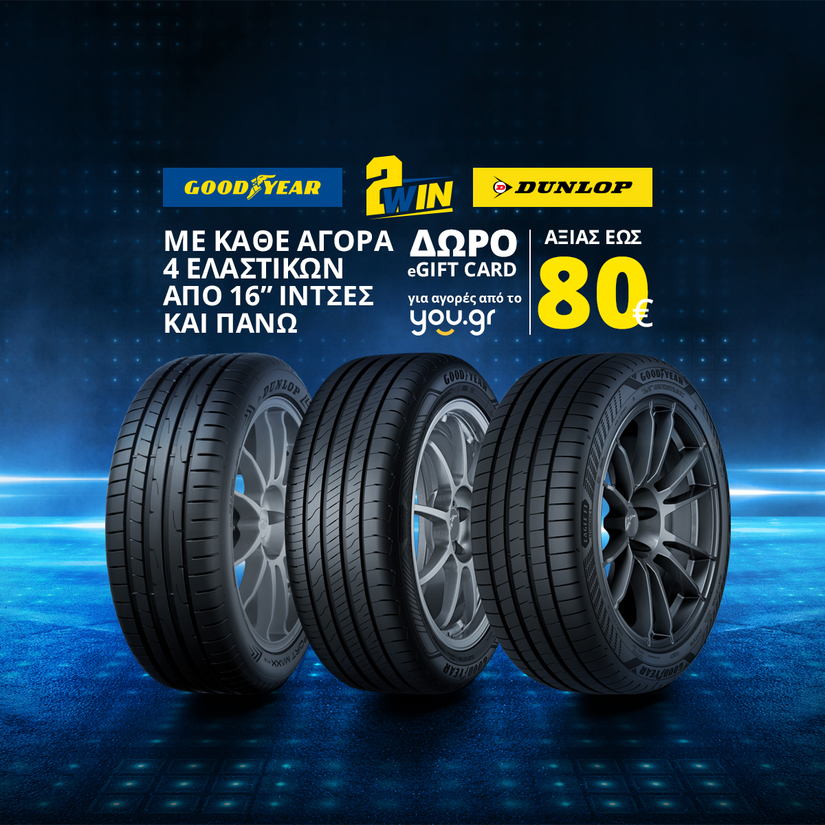 Η Goodyear, επιθυμώντας να ανταμείψει ακόμα μια φορά τους καταναλωτές, προσφέρει τη δυνατότητα να επωφεληθούν από την αγορά νέων ελαστικών Goodyear ή Dunlop με μία eGift card αξίας έως €80 για αγορές από το you.gr. Συγκεκριμένα, με κάθε αγορά 4 ελαστικών Goodyear ή Dunlop από 16 ίντσες και πάνω, οι καταναλωτές θα έχουν τη δυνατότητα να αποκτήσουν μια eGift card αξίας έως €80 για αγορές από το you.gr