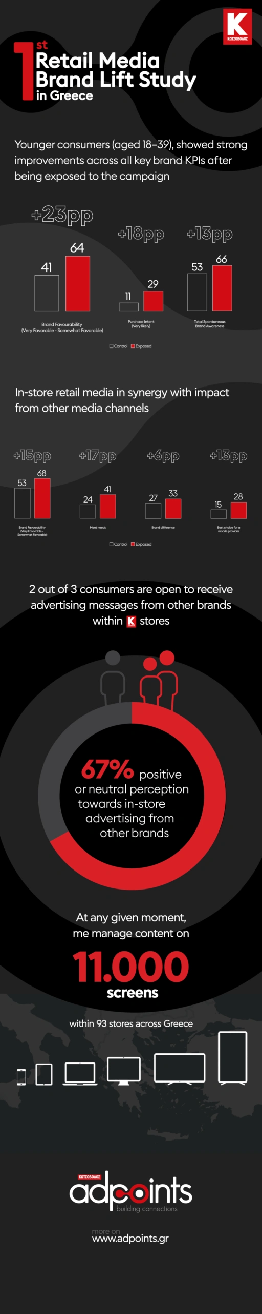 Η έρευνα, που πραγματοποιήθηκε από την Kantar για λογαριασμό της Tempo OMD και επικεντρώθηκε σε καμπάνια μεγάλου διαφημιζόμενου που προβλήθηκε μέσα από τα Retail Media της Κωτσόβολος, τα οποία περιλαμβάνουν μεταξύ άλλων ένα ολοκληρωμένο οικοσύστημα instore προβολής (Digital Signage & Sound Messages), τεκμηριώνει με σαφήνεια τον θετικό αντίκτυπο της instore έκθεσης σε κομβικούς δείκτες απόδοσης (KPIs) για το brand, φτάνοντας μέχρι και +23% στο κοινό στόχευσης!