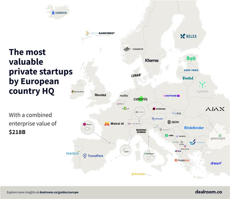Στον χάρτη που δημοσίευσε η ολλανδική εταιρεία, παρουσιάζονται οι πλέον δυναμικές startup εταιρείες ανά χώρα στην Ευρώπη και την Ευρασία. Ενδεικτικά, μεταξύ των χωρών της Ευρωπαϊκής ηπείρου, στην κορυφή βρίσκεται η βρετανική Revolut (Fintech), ενώ στην Ισπανία αναδεικνύεται η TravelPerk (Business Travel), στη Γαλλία η Mistral AI (Artificial Intelligence), στη Γερμανία η Celonis (Process Mining), στην Ιταλία η Bending Spoons (App Development), στην Ολλανδία η Mollie (Payments) και στη Σουηδία η Klarna (Buy Now, Pay Later).