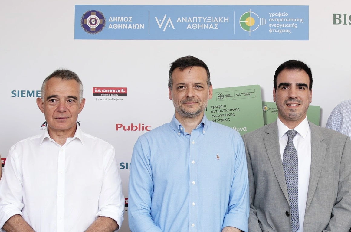 από αριστερά προς τα δεξιά: Ιωάννης Γεώργιζας, Διευθύνων Σύμβουλος της Αναπτυξιακής Εταιρείας του Δήμου Αθηναίων, Χάρης Δούκας, Δήμαρχος του Δήμου Αθηναίων, Χάρης Τολούμης, Country Head Smart Infrastructure Buildings, Siemens A.E.