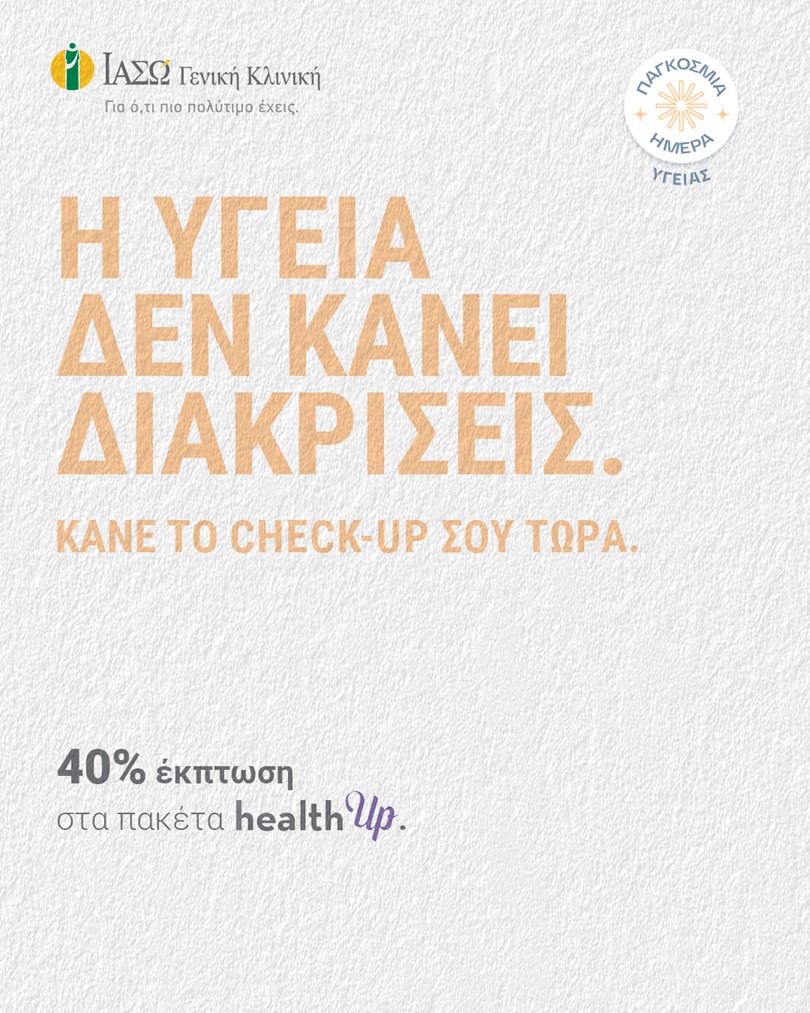 Κλείστε το ραντεβού σας στο υπερσύγχρονο Τμήμα Check – Up του ΙΑΣΩ Γενική Κλινική, Δευτέρα-Παρασκευή, 07:00-15:00, στα τηλέφωνα 210-6383090-1.