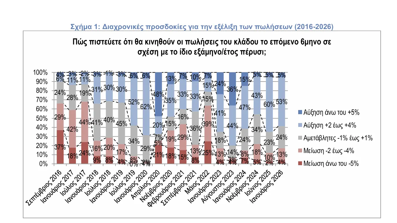 Περισσότεροι από τους μισούς συμμετέχοντες θεωρούν πιθανή την άνοδο των πωλήσεων στο επόμενο εξάμηνο, ενώ μειώνεται το ποσοστό εκείνων που φοβούνται πτώση. Η αισιοδοξία όμως είναι μετρημένη και δεν παραπέμπει σε δυναμική επέκταση.