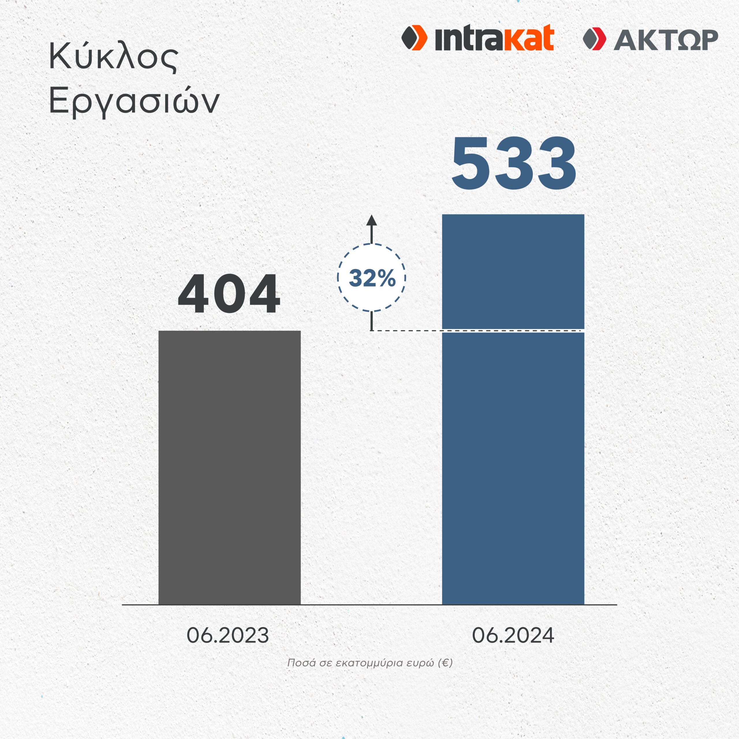 Με αφορμή την δημοσίευση των οικονομικών αποτελεσμάτων του πρώτου εξαμήνου 2024, ο Αντιπρόεδρος του Δ.Σ. και Διευθύνων Σύμβουλος της Intrakat κ. Αλέξανδρος Εξάρχου δήλωσε: «Τα οικονομικά αποτελέσματα του Α’ Εξαμήνου του 2024 αποδεικνύουν πόσο επιτυχημένη και σωστή ήταν η εξαγορά της ΑΚΤΩΡ και αυτό προκύπτει ξεκάθαρα από όλα όσα καταφέραμε από την ολοκλήρωση της εξαγοράς, μέχρι σήμερα. Πετύχαμε μία σημαντική αύξηση του κύκλου εργασιών, πολλαπλασιάζοντας τα προ φόρων, τόκων και αποσβέσεων έσοδα και τα μεικτά κέρδη, ενώ εκτιμούμε ότι στο τέλος του έτους ο κύκλος εργασιών θα φτάσει το €1,1 δισ. Όλα αυτά είναι απολύτως συμβατά με όλα όσα έχουμε ανακοινώσει στο παρελθόν – ό,τι έχουμε πει, το έχουμε κάνει. Παράλληλα, εργαζόμαστε σκληρά για τον εταιρικό μετασχηματισμό του Ομίλου μας, με στόχο την ενίσχυση και άλλων τομέων δραστηριότητας, πέραν της κατασκευής και σύντομα θα παρουσιάσουμε τον σχεδιασμό αυτόν».