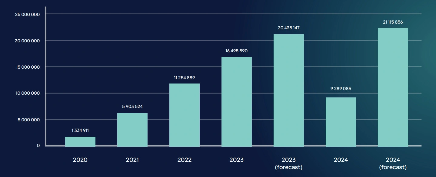 Αριθμός μολύνσεων από κακόβουλο λογισμικό κλοπής δεδομένων, 2020-2024. Πηγή: Kaspersky Digital Footprint Intelligence