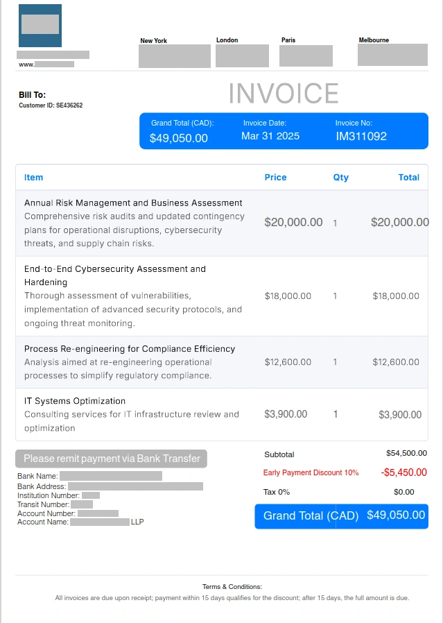 Άλλες περιπτώσεις περιλάμβαναν παρόμοια email που μιμούνταν την αλληλογραφία μεταξύ του διευθύνοντος συμβούλου και συνεργαζόμενων εταιρειών, ζητώντας την άμεση πληρωμή ενός ψεύτικου τιμολογίου, αλλά αυτή τη φορά το τιμολόγιο δεν ήταν συνημμένο.
