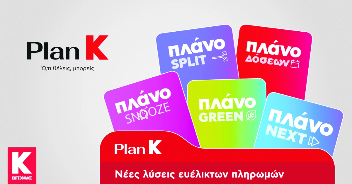 Μέσα από σύγχρονα χρηματοδοτικά εργαλεία και ευέλικτους τρόπους πληρωμής, το Plan K επιτρέπει σε κάθε καταναλωτή να αποκτήσει αυτό που επιθυμεί με τον τρόπο που τον εξυπηρετεί, ανεξάρτητα από τη φάση της ζωής του ή το μέγεθος της αγοράς που θέλει να πραγματοποιήσει.