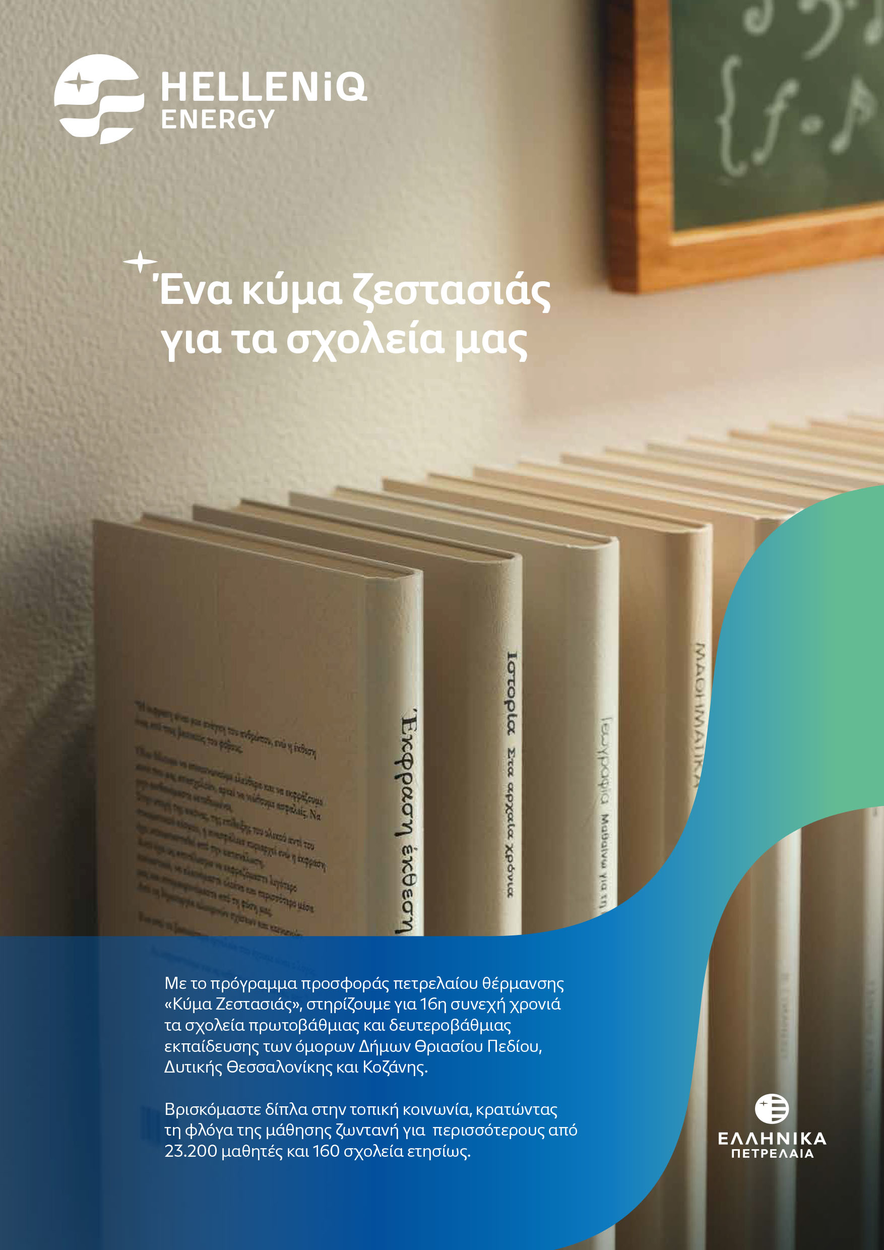 Μέσα από τη δράση «Κύμα ζεστασιάς», η HELLENiQ ENERGY βρίσκεται δίπλα σε περισσότερους από 23.200 μαθητές από περίπου 160 σχολεία ετησίως, εξασφαλίζοντας τους ένα ζεστό σχολικό περιβάλλον και υποστηρίζοντας έμπρακτα τις τοπικές κοινωνίες στις οποίες δραστηριοποιείται. Μόνο κατά την τελευταία τριετία, η προσφορά ξεπέρασε τα 690.000 λίτρα πετρελαίου θέρμανσης, τα οποία διατέθηκαν σε δημόσια σχολεία όλων των βαθμίδων.