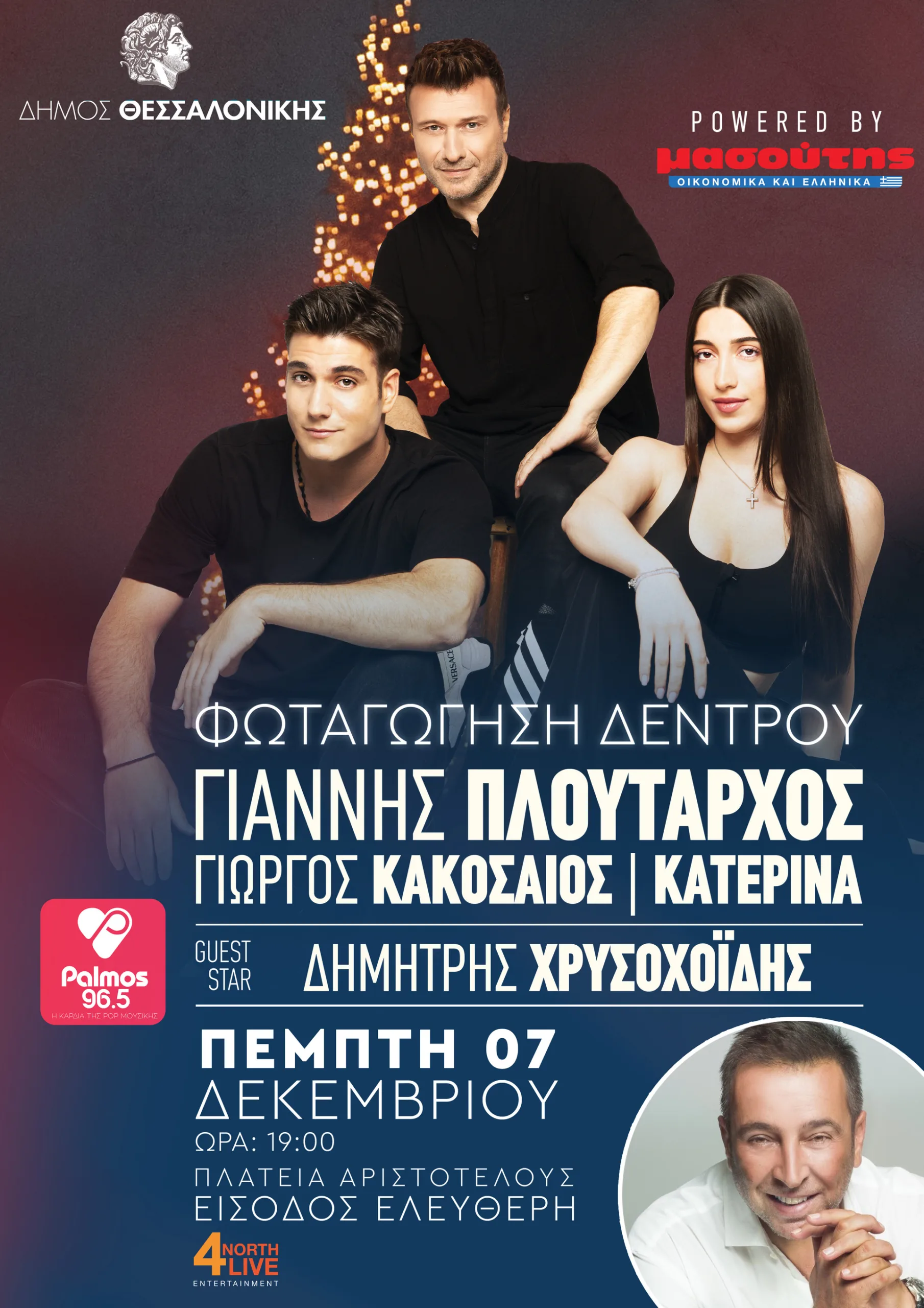 Αυτό το εορταστικό κλίμα θα πλαισιώσει ο δημοφιλής τραγουδιστής Γιάννης Πλούταρχος με μια μοναδική συναυλία που θα ερμηνεύσει όλες τις μεγάλες επιτυχίες του. Θα βρεθεί στη σκηνή παρέα με τα παιδιά του Γιώργο Κακοσαίο και Κατερίνα Κακοσαίου, ενώ θα κάνει guest εμφάνιση o Δημήτρης Χρυσοχοΐδης.