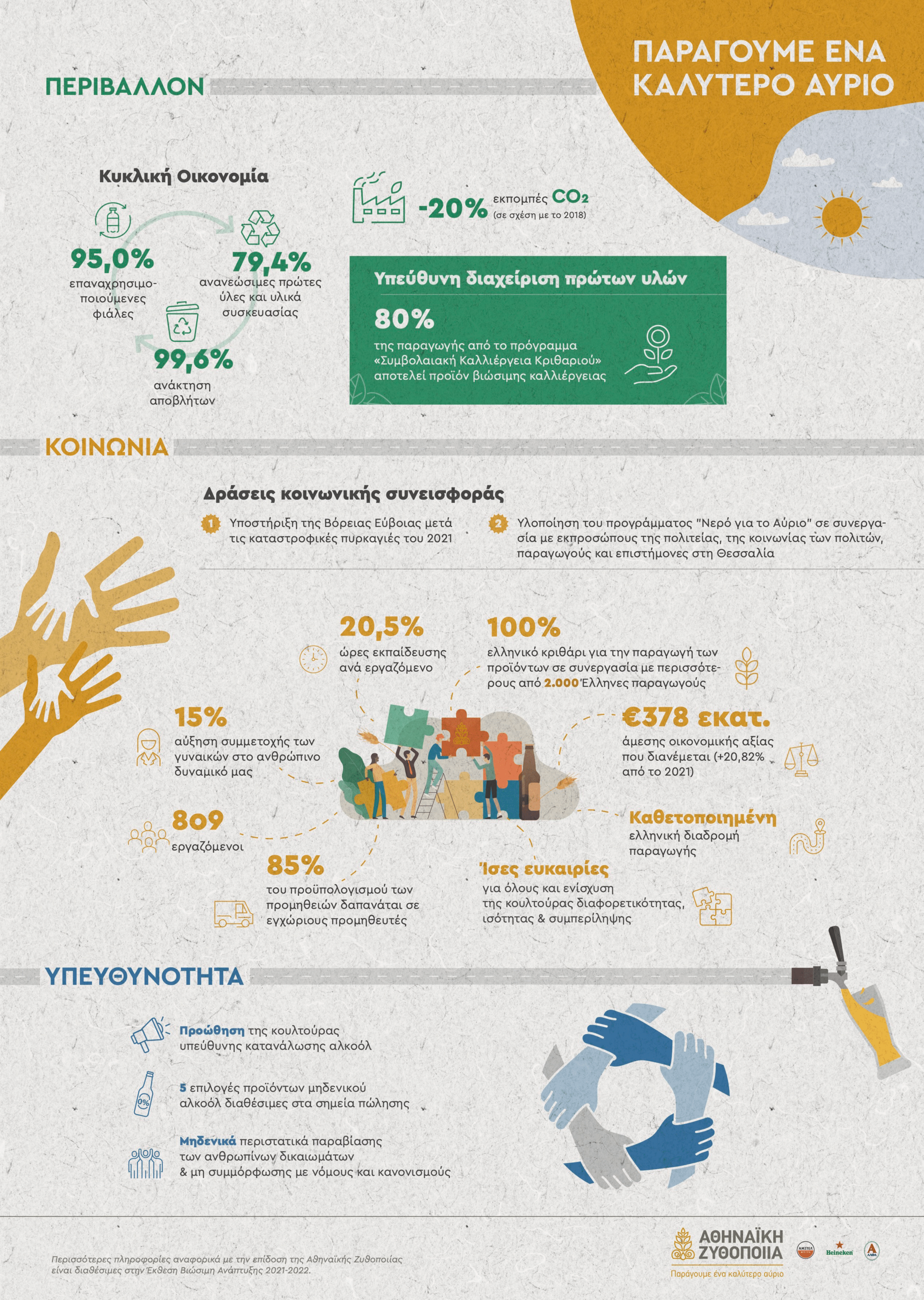 Ως προς τον πυλώνα της Υπευθυνότητας, η Αθηναϊκή Ζυθοποιία αποτελεί θεματοφύλακα της υπεύθυνης κατανάλωσης αλκοόλ στην Ελλάδα με σειρά δράσεων ενημέρωσης και ευαισθητοποίησης του καταναλωτικού κοινού. Την περίοδο 2021-2022 η εταιρεία δημιούργησε, σε συνεργασία με την Ένωση Bartenders Ελλάδος και την Μη Κυβερνητική Οργάνωση «Νηφάλιοι-στην υγειά μας», την εφαρμογή ‘ΣΕΡΒΙΡΩ ΥΠΕΥΘΥΝΑ’, με στόχο την πληροφόρηση των επαγγελματιών της εστίασης για τη σημασία και την αξία της υπεύθυνης διάθεσης αλκοόλ. Παράλληλα, συνεχίζει να ενισχύει την κατηγορία της μπίρας χωρίς αλκοόλ με συνολικά 5 επιλογές προϊόντων μηδενικού αλκοόλ διαθέσιμες στα σημεία πώλησης.