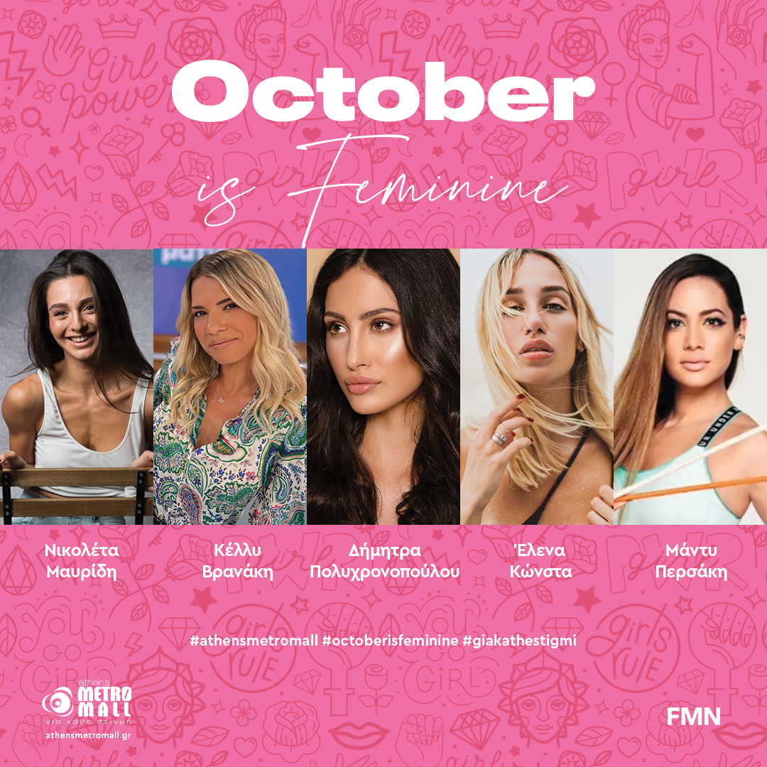 Μην ξεχάσετε! Καθ’ όλη τη διάρκεια του μήνα στηρίζουμε τις γυναίκες με τη δράση October is FEMININE. Επώνυμες Influencers και Celebrities θα επισκέπτονται τα καταστήματα των αγαπημένων brands του ATHENS METRO MALL και θα διοργανώνουν διαγωνισμούς με μοναδικά δώρα για εσάς.