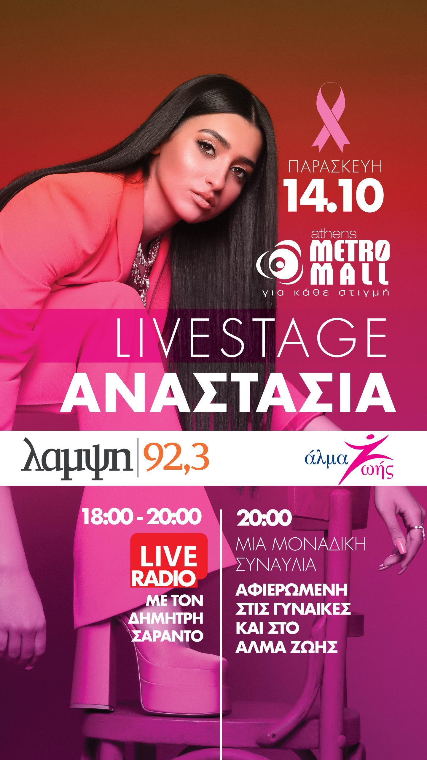 Η είσοδος στο μουσικό happening θα είναι ελεύθερη, ενώ η διασκέδαση θα ξεκινήσει μελωδικά από τις 18:00 με live εκπομπή του Λάμψη 92.3 με τον Δημήτρη Σαράντο, μέσα από τις εγκαταστάσεις του ATHENS METRO MALL, με άμεση διάδραση με το κοινό. Σκοπός αυτής της δράσης είναι η στήριξη του σημαντικού έργου του Πανελληνίου Συλλόγου Γυναικών με καρκίνο του μαστού, ΑΛΜΑ ΖΩΗΣ, καθώς ο Οκτώβριος είναι μήνας αφιερωμένος στην πρόληψη κατά του καρκίνου του μαστού.
