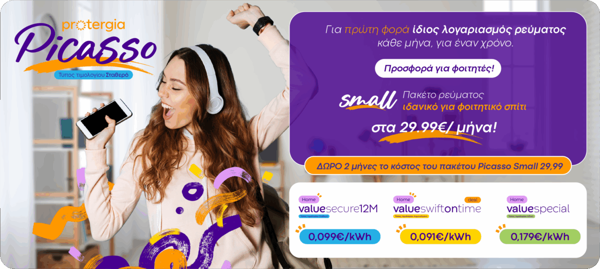 Ειδικά για φοιτητές η Protergia προσφέρει το Protergia Picasso Small 1 που καλύπτει όλο το κόστος ενέργειας του φοιτητικού σπιτιού με 29,99€ το μήνα για να ξέρεις ακριβώς τι θα πληρώνεις κάθε μήνα. Και επιπλέον, 2 μήνες ΔΩΡΟ.