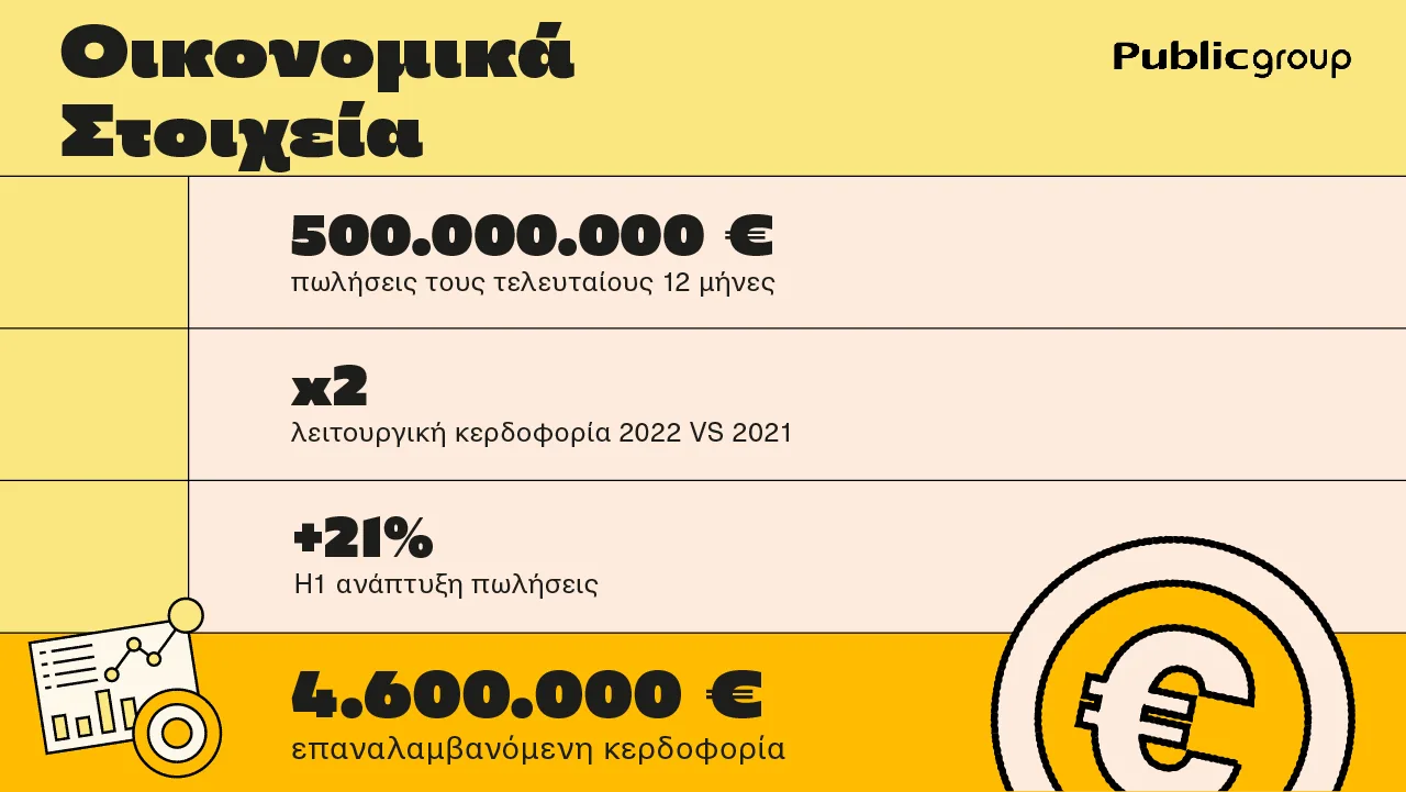 Ακόμη, κατάφερε 21% ανάπτυξη πωλήσεων το πρώτο εξάμηνο του 2023 σε σχέση με το 2022. Η επιτυχημένη απορρόφηση της MediaMarkt κάτω από το νέο concept store “Public + home”, το δυναμικό πλάνο επενδύσεων ύψους €30 εκ. και η συνεχής ανάπτυξη καινοτόμων υπηρεσιών σε συνεργασία με κορυφαίες scale-up εταιρείες διαμόρφωσαν μία ισχυρή βάση για το brand Public, τοποθετώντας το σε ηγετική θέση στον τομέα του Οmnichannel λιανεμπορίου.