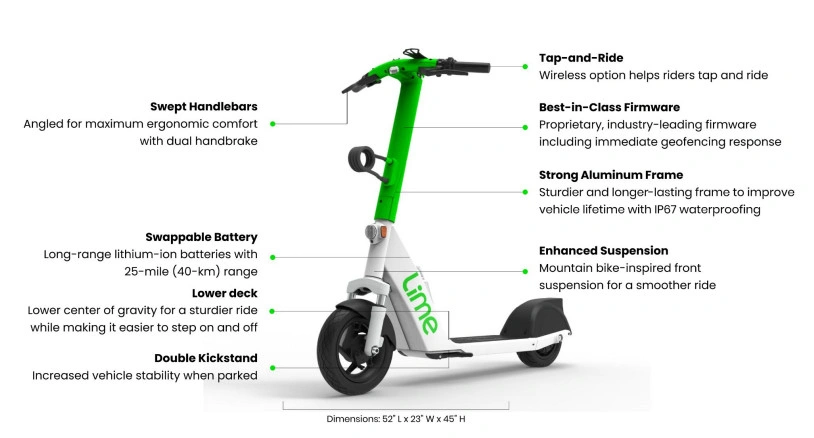 Η Lime διαθέτει πάνω από 250.000 κοινόχρηστα ηλεκτρικά οχήματα παγκοσμίως, με περισσότερα από 190.000 ηλεκτρικά πατίνια σε 280 πόλεις και περισσότερα από 50.000 ηλεκτρικά ποδήλατα σε σχεδόν 50 πόλεις. Το μοντέλο GEN4.1, που αναπτύχθηκε από την ομάδα μηχανικών της Lime, η οποία αποτελείται από περισσότερους από 150 εργαζόμενους, βασίζεται σε δεδομένα από 700 εκατομμύρια διαδρομές παγκοσμίως και προσφέρει μια βελτιωμένη εμπειρία, προσαρμοσμένη σε αστικά περιβάλλοντα όπως η Αθήνα και η Θεσσαλονίκη.