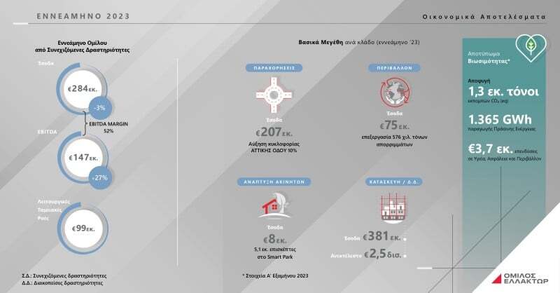Η παρουσίαση των αποτελεσμάτων του Ομίλου ΕΛΛΑΚΤΩΡ για το 9M 2023, γίνεται διακριτά σε Συνεχιζόμενες Δραστηριότητες (Σ.Δ.) και Διακοπείσες Δραστηριότητες (Δ.Δ.)· οι τελευταίες περιλαμβάνουν την ΑΚΤΩΡ μέχρι 30.9.2023 και την δραστηριότητα των ανανεώσιμων πηγών ενέργειας μέχρι 31.12.2022.