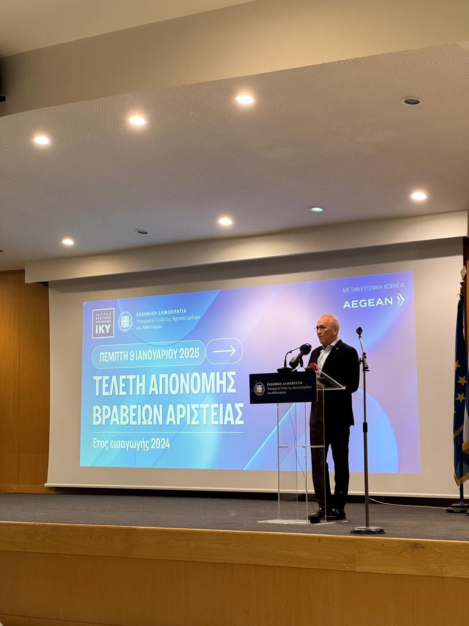 Τα βραβεία για τους περίπου 2.300 δικαιούχους φοιτητές ανακοινώθηκαν από τον CEO της AEGEAN, κ. Δημήτρη Γερογιάννη, παρουσία του Υπουργού, κ. Κυριάκου Πιερρακάκη, και της Προέδρου του ΙΚΥ κ. Βάσω Κιντή, αναδεικνύοντας τη διαχρονική δέσμευση της αεροπορικής να επιβραβεύει την αριστεία.