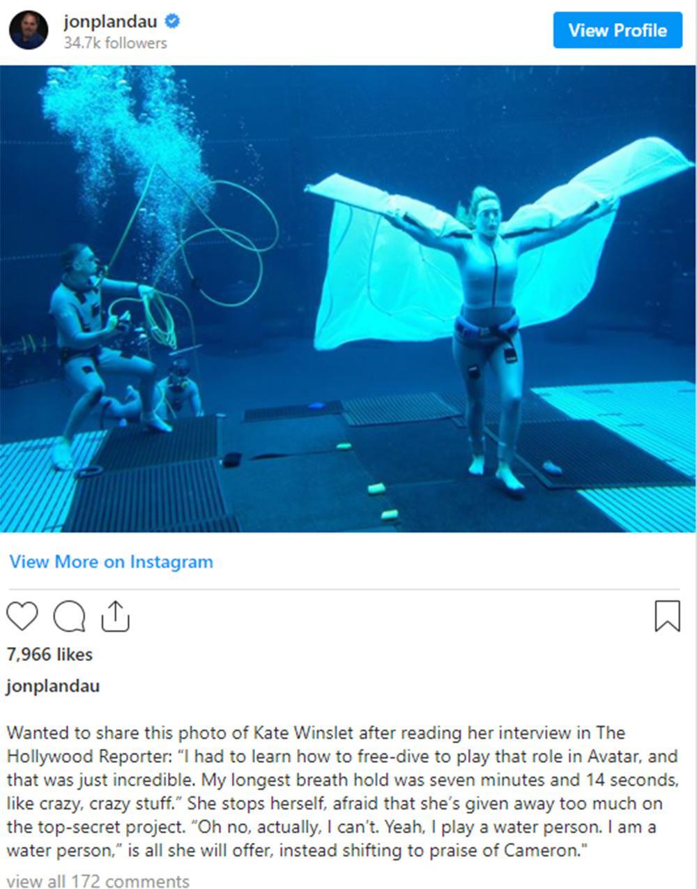 Την φωτογραφία από τα γυρίσματα του σίκουελ της αμερικανικής περιπέτειας επιστημονικής φαντασίας, με την Κέιτ Γουίνσλετ να περπατά στον πυθμένα μίας τεράστιας δεξαμενής, φορώντας βάρη και ένα είδος φτερών, ενσαρκώνοντας κάποιο πλάσμα του νερού, δημοσίευσε στο instagram ο παραγωγός Τζον Λαντάου, ο οποίος είχε συνεργαστεί με τον Τζέιμς Κάμερον και στην ταινία «Τιτανικός» με πρωταγωνίστρια την Αγγλίδα ηθοποιό.
