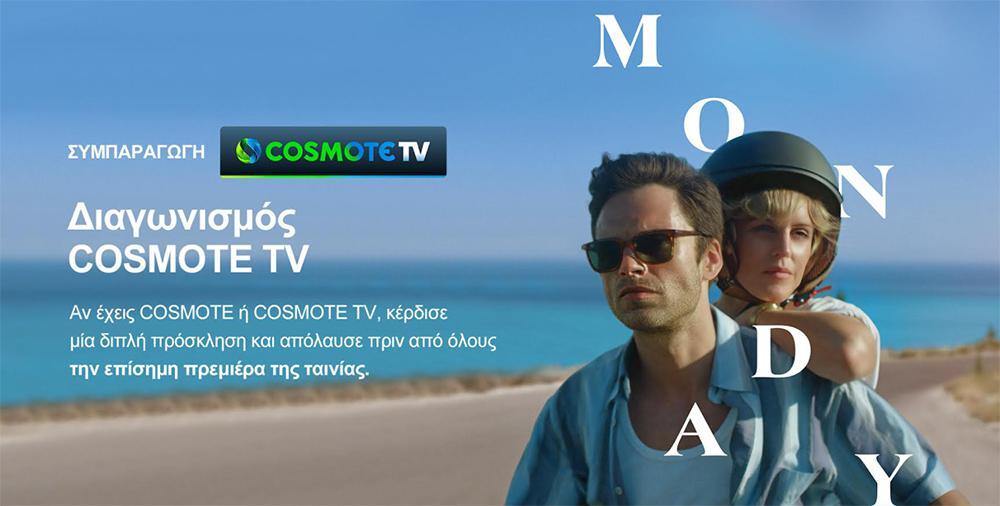 Η COSMOTE TV διοργανώνει διαγωνισμό δίνοντας την ευκαιρία σε δέκα τυχερούς συνδρομητές της ή πελάτες COSMOTE, να κερδίσουν από μία διπλή πρόσκληση για την επίσημη πρεμιέρα της ταινίας «Monday», που θα πραγματοποιηθεί την Τρίτη 22 Ιουνίου στο Σινέ Θησείο, παρουσία της πρωταγωνίστριας Ντενίζ Γκoφ και του σκηνοθέτη Αργύρη Παπαδημητρόπουλου.