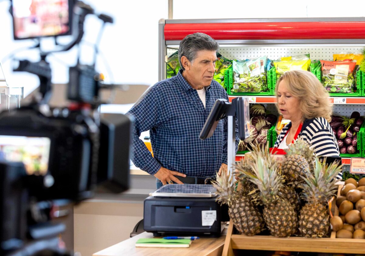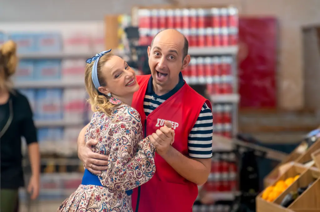 Στον πάγκο με τα τυριά και τα αλλαντικά, ο… ολίγον πρωτόγονος Περικλής (Σταύρος Μαρκάλας) δεν χάνει ευκαιρία να τραγουδάει καψουροτράγουδα, να την «πέφτει» στις πελάτισσες και, κυρίως, να σπάει τα νεύρα της εντυπωσιακά όμορφης και εντυπωσιακά ζόρικης βίγκαν χασάπισσας, Χαριστέλλας (Νατάσα Εξηνταβελώνη), που δεν σηκώνει μύγα… στον μπαλτά της.