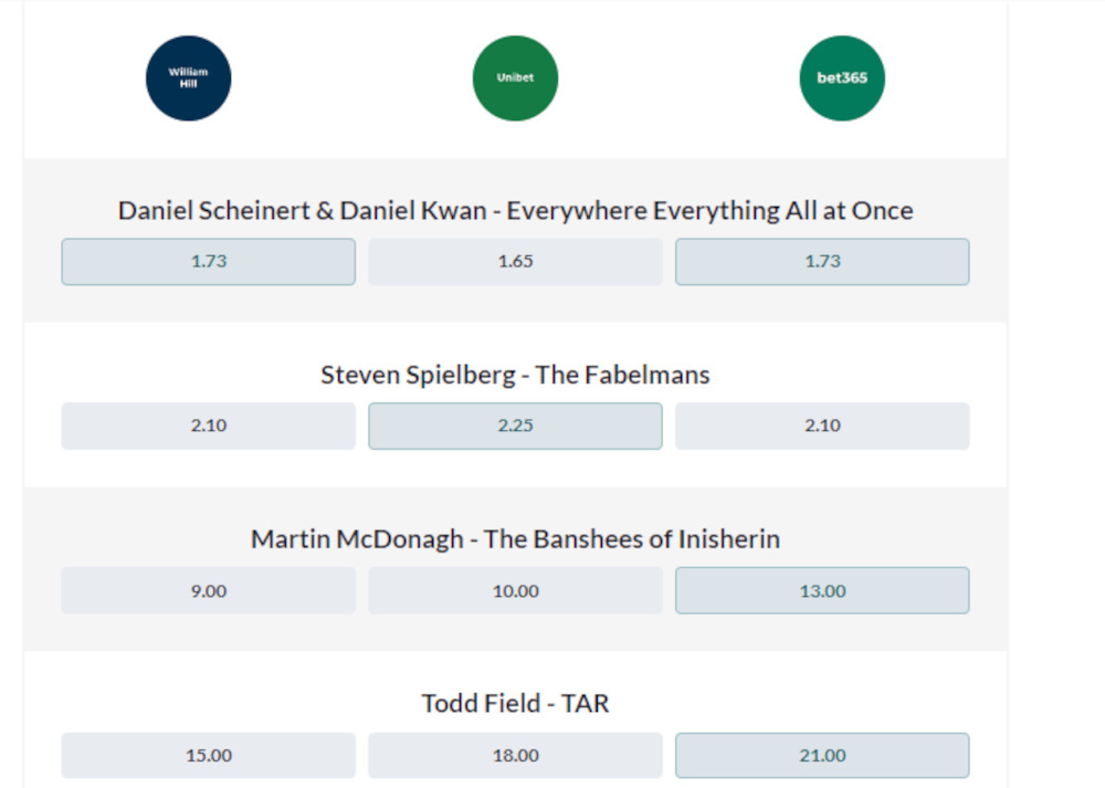 Φέτος βλέπουμε πως υπάρχει ένα ξεκάθαρο φαβορί. O λόγος για τους Daniel Kwan & Daniel Scheinert και το «Everything Everywhere All At Once» που δίνει απόδοση 1,65. Ακολουθεί ο Steven Spielberg (με το «The Fabelmans») και με απόδοση 2,10 και σε μακρινή απόσταση ο Martin McDonagh με το «The Banshees of Inisherin» με απόδοση 9,00.