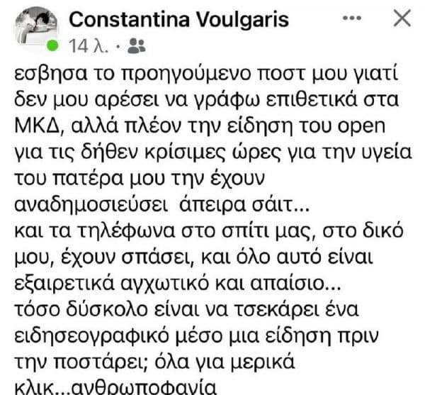 «Έσβησα το προηγούμενο ποστ μου γιατί δεν μου αρέσει να γράφω επιθετικά στα ΜΚΔ, αλλά πλέον την είδηση του open και τις κρίσιμες ώρες για την υγεία του πατέρα μου την έχουν αναδημοσιεύσει άπειρα σαιτ… και τα τηλέφωνα στο σπίτι μας, στο δικό μου, έχουν σπάσει, και όλο αυτό είναι εξαιρετικά αγχωτικό και απαίσιο…τόσο δύσκολο είναι να τσεκάρει ένα ειδησεογραφικό μέσο μια είδηση πριν την ποστάρει; Όλα για μερικά κλικ…ανθρωποφαγία»