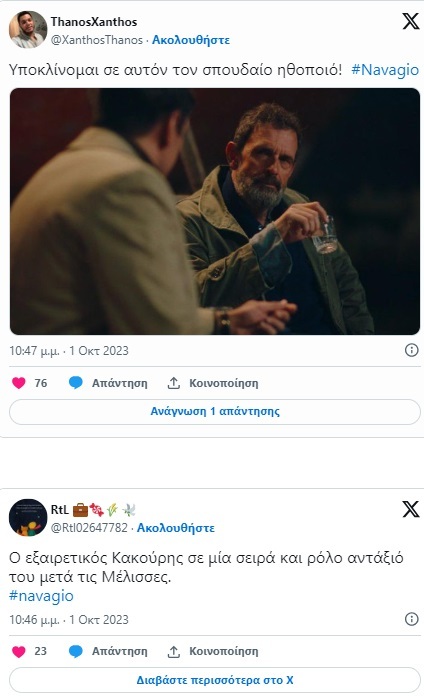 Δεν έλειψαν βέβαια και τα τρολαρίσματα, οι συγκρίσεις με άλλες σειρές μυθοπλασίας και οι αναφορές στην παρουσία πρωταγωνιστών της σειράς «Το Ναυάγιο» σε αυτές. Σε κάθε περίπτωση, όμως, «Το Ναυάγιο» έφερε… σεισμό στο Twitter καθώς κατακλείστηκε από σχόλια το hashtag #navagio.