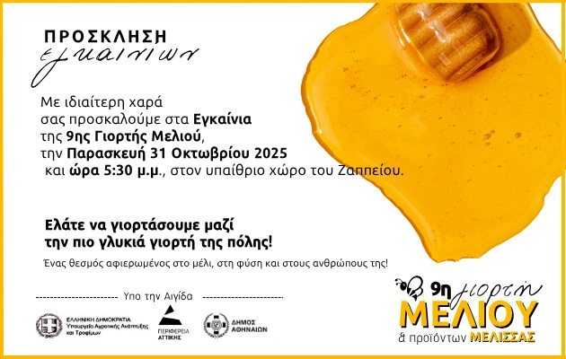 Από την Πέμπτη 30 Οκτωβρίου έως και τη Δευτέρα 3 Νοεμβρίου, η 9η Γιορτή Μελιού μάς καλεί να ζήσουμε από κοντά την πιο γλυκιά εμπειρία της χρονιάς.