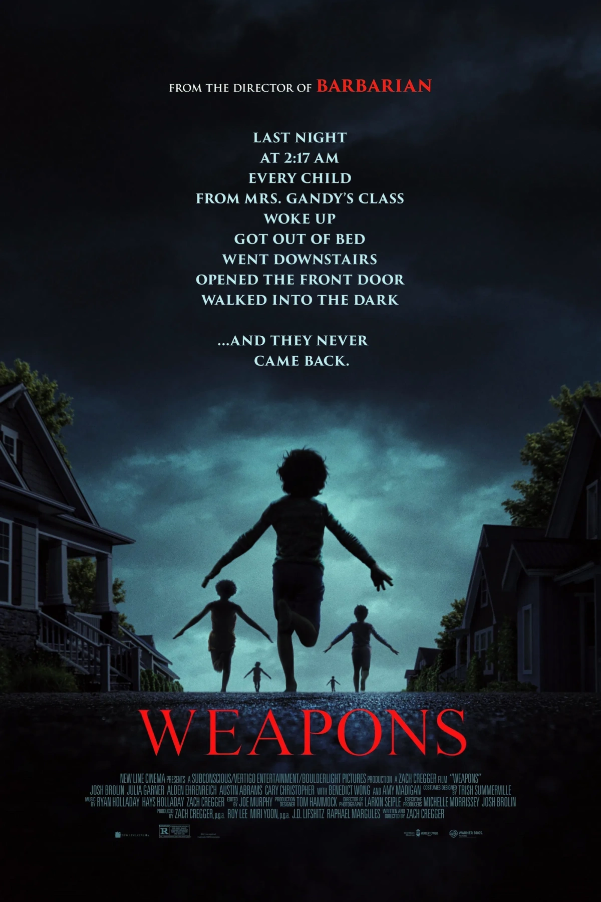 Τέλος, το «Weapons» σε σενάριο και σκηνοθεσία του Ζακ Γκρέγκλερ, που αφηγείται το χρονικό εξαφάνισης δεκαεπτά παιδιών από μια τάξη δημοτικού, μια συγκεκριμένη ώρα μετά τα μεσάνυχτα, σε μια επαρχιακή πόλη της Αμερικής, είναι το θρίλερ της χρονιάς, καταχωρημένο σε δεκάδες λίστες με τις καλύτερες ταινίες της χρονιάς, με 300 εκατομμύρια δολάρια σε παγκόσμιες εισπράξεις. Η ταινία προτάθηκε για το Όσκαρ Β’ Γυναικείου Ρόλου για την Έιμι Μάντιγκαν, στον ρόλο της θείας Γκλάντις, ενώ πρόσφατα ανακοινώθηκε ότι ο χαρακτήρας της θα αποκτήσει μια αυτόνομη ταινία.