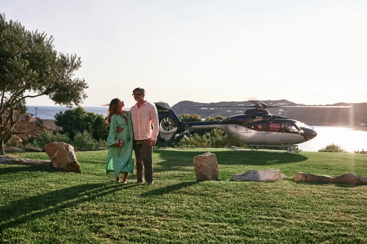 Επισφραγίζοντας την εμπειρία της απόλυτης πολυτέλειας, η Myconian Collection παρέχει υπηρεσίες ναύλωσης ιδιωτικών ελικοπτέρων. Με απευθείας αναχωρήσεις από το ιδιωτικό ελικοδρόμιο του ομίλου στην Ελιά, οι επισκέπτες μπορούν να απολαύσουν θεαματικές εναέριες περιηγήσεις πάνω από το Αιγαίο ή να εξασφαλίσουν την ταχύτερη δυνατή μεταφορά τους.
