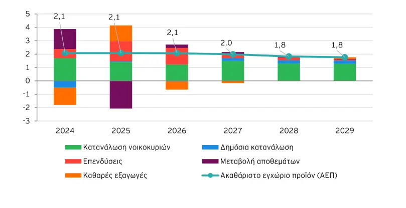 Η ανάπτυξη του ΑΕΠ στην Ελλάδα προβλέπεται να σταθεροποιηθεί στο 2,1% το 2026 (σε παρόμοια επίπεδα με το 2025), παραμένοντας πάνω από τον μέσο όρο της Ευρωζώνης. Η ανάπτυξη αναμένεται να στηριχθεί κυρίως από την επενδυτική δραστηριότητα, αντανακλώντας τη συνεχιζόμενη υλοποίηση έργων χρηματοδοτούμενων από το NextGenerationEU (NGEU). Την ίδια στιγμή, η ιδιωτική κατανάλωση προβλέπεται να επιβραδυνθεί ελαφρώς, καθώς η σύγκρουση στη Μέση Ανατολή αναμένεται να έχει επιπτώσεις στις τιμές. Ο επενδυτικός χαρακτήρας της ανάπτυξης συνοδεύεται από σημαντική αύξηση των εισαγωγών, η οποία περιορίζει τη συμβολή του εμπορικού ισοζυγίου, παρά τη συγκρατημένη αύξηση των εξαγωγών.