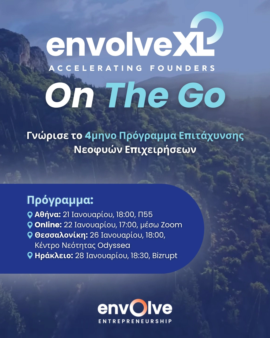 Σε συνεργασία με φορείς και πρωτοβουλίες του δικτύου του, έρχεται το “Envolve On The Go”, ένα ταξίδι για την εξερεύνηση, ανάδειξη και διασύνδεση της startup κοινότητας σε κομβικές πόλεις της Ελλάδας. Οι συναντήσεις αυτές φιλοξενούν startups, επιχειρηματίες, επενδυτές και οργανισμούς στήριξης της καινοτομίας. Στο πλαίσιο των συναντήσεων αυτών, οι ενδιαφερόμενοι μπορούν – μεταξύ άλλων – να ενημερωθούν για το πρόγραμμα επιχειρηματικής επιτάχυνσης EnvolveXL (https://envolveglobal.org/envolvexl) που στηρίζει 20 startups ετησίως, μέσα από επιχειρηματική καθοδήγηση, διεθνή δικτύωση, καθώς και πρόσβαση σε επενδυτικές ευκαιρίες έως 265.000€.