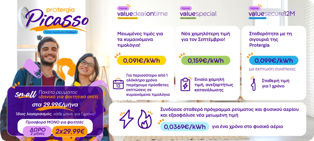 Τώρα, με την έναρξη της νέας ακαδημαϊκής χρονιάς, η Protergia φροντίζει και για τους φοιτητές, με μια μοναδική προσφορά. Συγκεκριμένα, προσφέρει το Protergia Picasso Small 1 που καλύπτει όλο το κόστος ενέργειας του φοιτητικού σπιτιού με 29,99€ το μήνα για να ξέρεις ακριβώς τι θα πληρώνεις κάθε μήνα. Και επιπλέον, 2 μήνες ΔΩΡΟ.