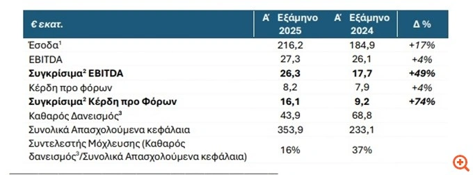 • Τα Συγκρίσιμα Κέρδη προ Φόρων, Τόκων και Αποσβέσεων (EBITDA) ανήλθαν σε €26,3 εκατ., αυξημένα κατά 49%.