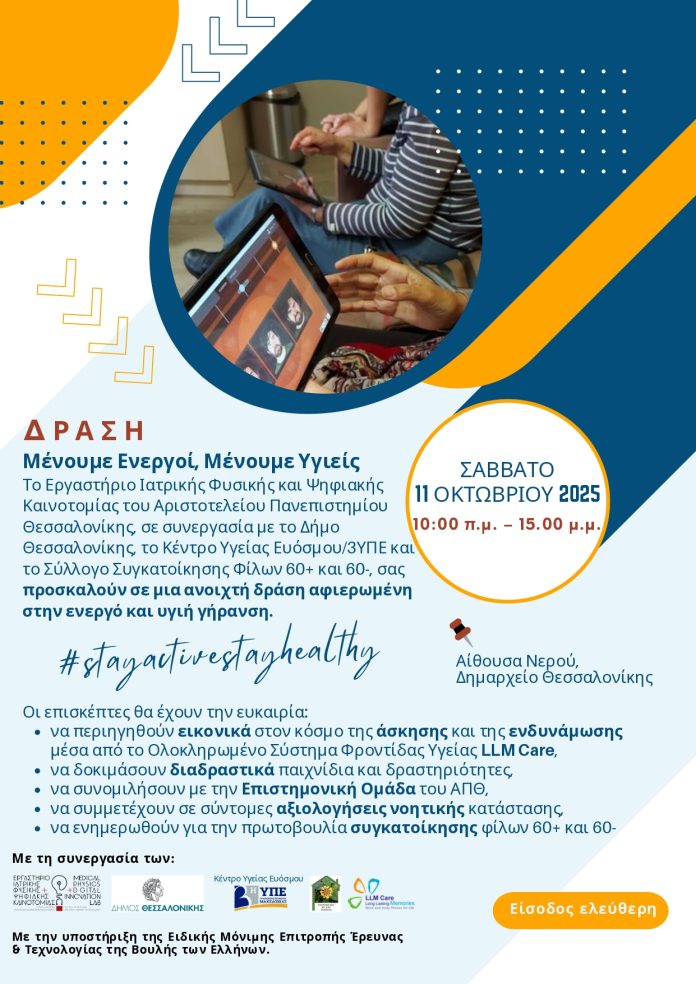 Οι επισκέπτες θα έχουν την ευκαιρία να περιηγηθούν εικονικά στον κόσμο της άσκησης και της ενδυνάμωσης μέσα από το Ολοκληρωμένο Σύστημα Φροντίδας Υγείας LLM Care, να συμμετάσχουν σε διαδραστικά παιχνίδια και δραστηριότητες, να συνομιλήσουν με την Επιστημονική Ομάδα του ΑΠΘ, να λάβουν μέρος σε σύντομες αξιολογήσεις νοητικής κατάστασης και να ενημερωθούν για την πρωτοβουλία Συγκατοίκησης Φίλων 60+ και 60- .