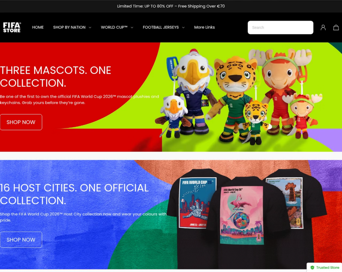 Μια άλλη ψεύτικη ιστοσελίδα δίνει τη δυνατότητα αγοράς “επίσημων προϊόντων” της διοργάνωσης, προβάλλοντας εικόνες με λούτρινα της μασκότ και μπλουζάκια σε μεγάλη ποικιλία. Για να ενισχύσει την ελκυστικότητα της προσφοράς, εμφανίζει σημαντικές εκπτώσεις. Παράλληλα, προκειμένου να φαίνεται πιο αξιόπιστη, οι δράστες έχουν προσθέσει σήμα “Trusted store” στο κάτω μέρος της σελίδας, καθώς και φόρμα εγγραφής που ζητά προσωπικά και τραπεζικά στοιχεία.