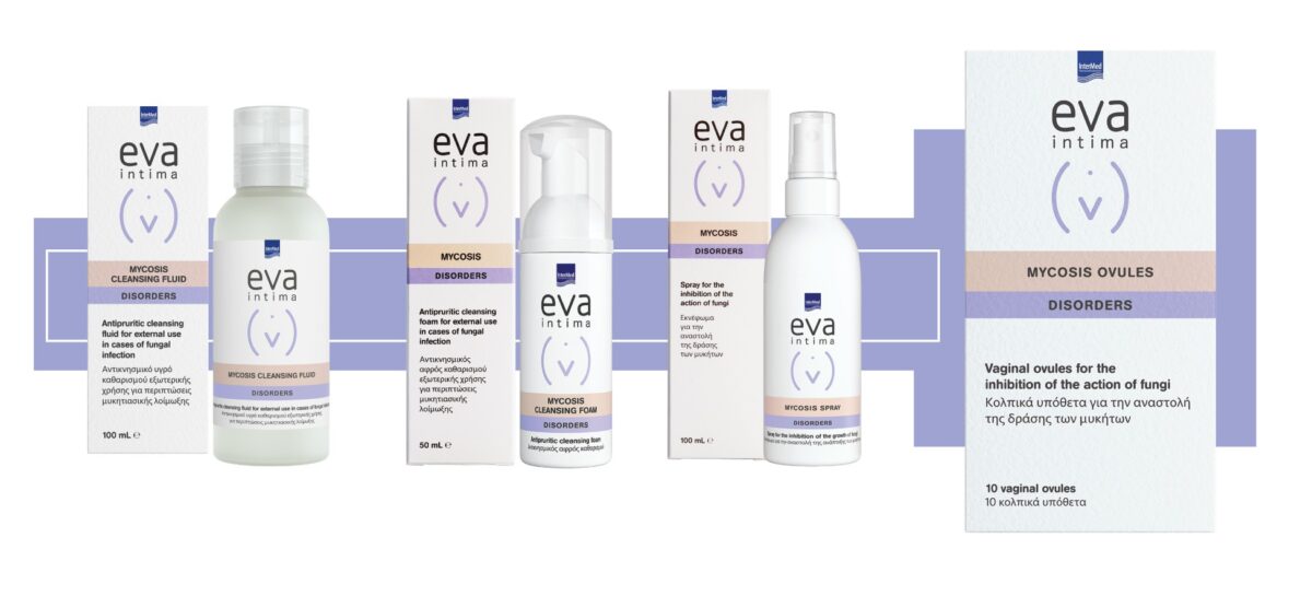 Mε αντίστοιχη δράση, τα σκευάσματα Eva Intima Mycosis cleanser foam, cleansing fluid & intimate spray, ενισχύουν την πιο ολοκληρωμένη φροντίδα της ευαίσθητης περιοχής και άλλων δερματικών περιοχών, όταν υπάρχει μυκητιασική λοίμωξη.