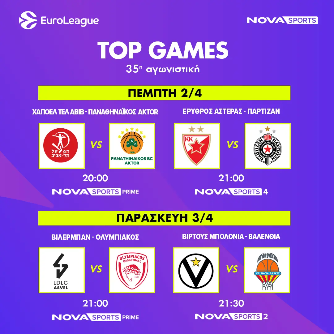 Αρχικά, ο Παναθηναϊκός AKTOR θα αντιμετωπίσει εκτός έδρας στην ουδέτερη Σόφια την Χάποελ Τελ Αβιβ (2/4, 20:00), ενώ ο Ολυμπιακός θα ταξιδέψει για τη Γαλλία εκεί όπου θα αντιμετωπίσει τη Βιλερμπάν (3/4, 21:00). Η απόλυτη μπασκετική εκπομπή, Playmakers θα μεταφέρει όλα όσα συμβούν στα παρκέ της EuroLeague με την πληρέστερη και αρτιότερη δημοσιογραφική κάλυψη και εκλεκτούς καλεσμένους.