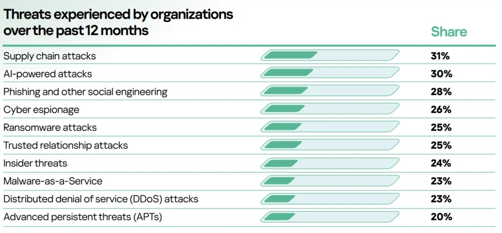 Σύμφωνα με την έρευνα που ανέθεσε η Kaspersky, το 31% των επιχειρήσεων επηρεάστηκε από επίθεση στην εφοδιαστική αλυσίδα κατά τη διάρκεια των τελευταίων 12 μηνών, ποσοστό μεγαλύτερο από οποιονδήποτε άλλο τύπο κυβερνοαπειλής. Ο κίνδυνος για τις εφοδιαστικές αλυσίδες αφορά κυρίως τους οργανισμούς που διαθέτουν πιο εκτεταμένο βαθμό διασύνδεσης, με τις μεγάλες επιχειρήσεις να αναφέρουν το υψηλότερο ποσοστό επιθέσεων — 36% — σε σύγκριση με τις μικρές[2 και μεσαίες[3] επιχειρήσεις.