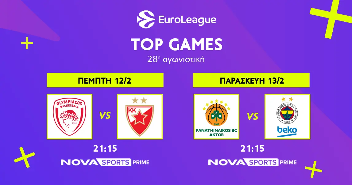 Στην κορυφαία ευρωπαϊκή διασυλλογική διοργάνωση, στην EuroLeague και για την 28η αγωνιστική, o Ολυμπιακός υποδέχεται στο ΣΕΦ τον Ερυθρό Αστέρα (12/2, 21:15), ενώ ο Παναθηναϊκός AKTOR θα αντιμετωπίσει στο κλειστό του ΟΑΚΑ την Φενέρμπαχτσε (13/2, 21:15).