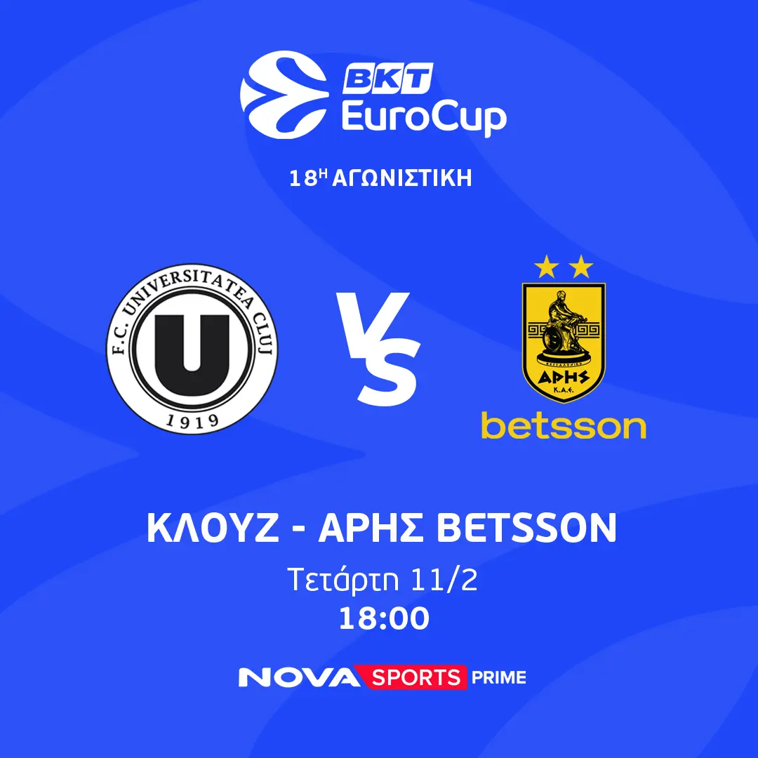 18:00 EuroCup: Κλουζ-Άρης Betsson Novasports Prime σε περιγραφή του Γρηγόρη Παπαβασιλείου