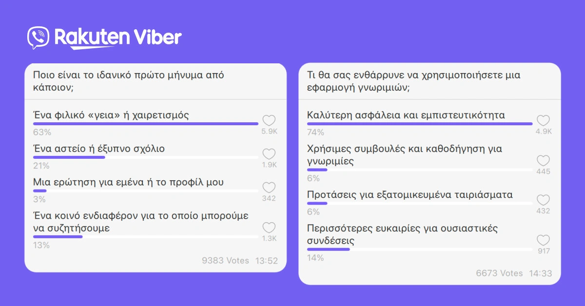 Οι δημοσκοπήσεις δείχνουν ξεκάθαρα: οι γυναίκες στην Ελλάδα θέλουν εφαρμογές γνωριμιών που προσφέρουν έναν ασφαλή και με σεβασμό χώρο, όπου μπορούν να συνδεθούν αυθεντικά και να αποφύγουν παράξενες εμπειρίες. Το Viber Dating ανταποκρίνεται σε αυτή την ανάγκη, προσφέροντας έναν χώρο όπου οι χρήστες εγγράφονται με τον αριθμό τηλεφώνου τους, εξασφαλίζοντας ότι μόνο πραγματικοί άνθρωποι συμμετέχουν και διατηρώντας την εμπιστευτικότητα, με κρυφό αριθμό τηλεφώνου και ξεχωριστό προφίλ γνωριμιών από τον κύριο λογαριασμό Viber. Επιπλέον, όλοι στο Viber Dating μπορούν να κρύψουν το προφίλ τους από συγκεκριμένες ή όλες τις επαφές, καθώς και από συγκεκριμένες ομάδες. Γιατί, στον πυρήνα του, το Viber Dating είναι για Πραγματικούς Ανθρώπους. Πραγματικές Συνομιλίες. Πραγματικές Συνδέσεις.