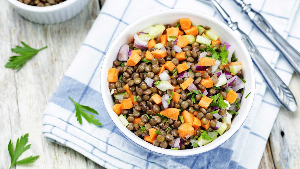 Αφαίρεσε από τον φούρνο και άφησέ τα για 10 λεπτά να κρυώσουν. - Ζέστανε ένα κατσαρολάκι με νερό ως την μέση και μόλις ξεκινήσει ο βρασμός ρίξε τις φακές, χαμήλωσε την φωτιά και σιγόβρασε για περίπου 20 λεπτά. Σούρωσε τις φακές και άφησέ τες να κρυώσουν πριν τις ρίξεις σε ένα μεγάλο μπολ.