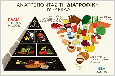 Η νέα κυβέρνηση των ΗΠΑ, υπό την καθοδήγηση του Ντόναλντ Τραμπ και με «αρχιτέκτονα» της νέας υγειονομικής πολιτικής τον Ρόμπερτ Κένεντι Τζούνιορ, παρουσίασε μία ανεστραμμένη πυραμίδα που φέρνει τα πάνω κάτω στο παγκόσμιο διατροφικό γίγνεσθαι. Δεν πρόκειται απλώς για αλλαγή στις συστάσεις, αλλά για ιδεολογική και πολιτική παρέμβαση στον τομέα της Υγείας, όπως επισημαίνουν οι επιστήμονες στον τομέα της διατροφής. Με κεντρικό σύνθημα «Eat Real Food» (τρώτε πραγματικό φαγητό), η νέα αμερικανική ηγεσία επιτίθεται στα επεξεργασμένα τρόφιμα, κάτι που είναι θεμιτό και κοινά παραδεκτό, αλλά από την άλλη, προκαλεί την επιστημονική κοινότητα τοποθετώντας τις ζωικές πρωτεΐνες και τα πλήρη λιπαρά σε πρώτο πλάνο. Πρόκειται για κίνηση που πολλοί χαρακτηρίζουν «προβοκατόρικη», η οποία όμως έρχεται να απαντήσει στην επιδημία της παχυσαρκίας που μαστίζει -κυρίως- τις ΗΠΑ.